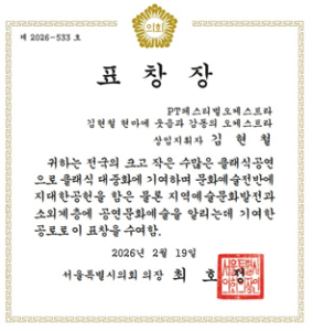 또한 이번 공연은 서울특별시의회 의장의 표창장을 수여 받아, 클래식 대중 문화에 공헌하는 뜻깊은 자리였음을 인정받았다.